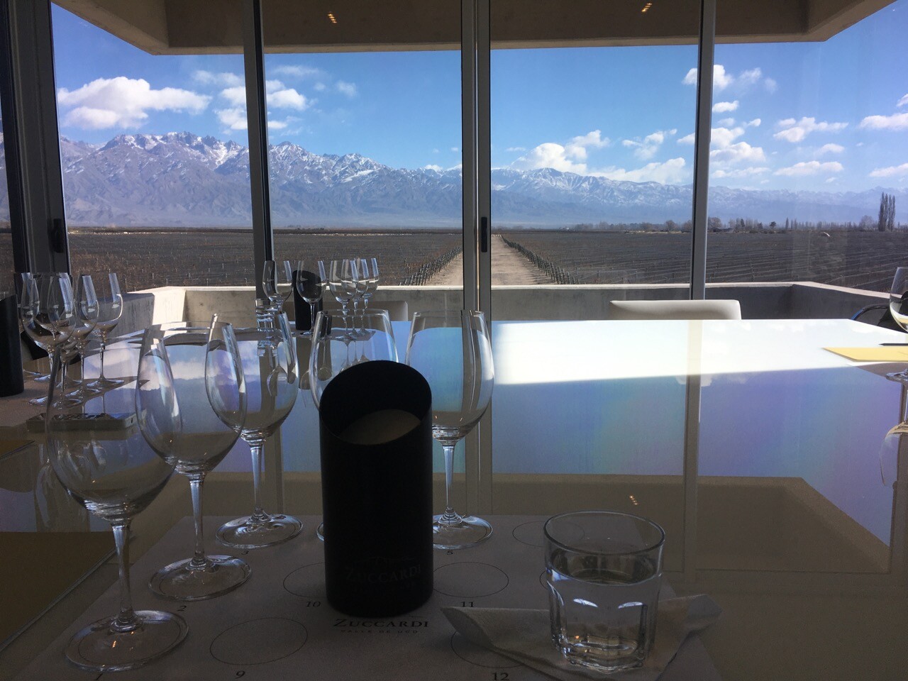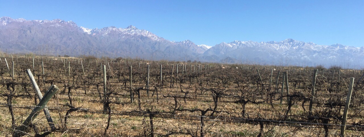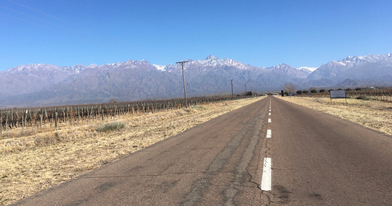 It was indeed great to be back in my second favourite Argentine city, Mendoza and the provence with the always looming Los Andes ever-present and most welcoming. It is mid-winter here and I was a little surprised that there was no snow to be seen on the mountains. Okay a little upon the top of Aconcagua and her neighbours but otherwise, and hauntingly enough, no snow! I have no idea what this will mean for the 2022 harvest or for that matter the subsequent harvests in Mendoza. The Mendocino’s are 99.9% reliable on the snow melt from up top, to grow their grapes. As you can see here in the NASA (Nice Attitude Sensible Attire) aerial image, the snow cover is usually everywhere. Then there’s my photo which was taken from my last visit back in 2016, again snow everywhere! as you can see. I think we even went skiing that year.