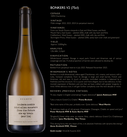 The nose, le nez, is what brings me to the second version of Bodega Sugrue´s Bonkers V2 (the vines are to be found somewhere in The South Downs, England), please see the label for their full explanation. The wine is made from a blend of three vintages of their Chardonnay under a Solera (Flor) system: 2022, 2023 and 2024. Open the bottle, if you can find one that is, and pour a glass. On the nose you will find a Citrusy, Brioche and a white flowerish nose. On the palate, you will come across a texture that reminds me of a fine Chevalier-Montrachet (God only knows why) I drank recently in London. Heaps of fine Maldon salt finishing with a desperate need to drink more of the same, as if this Bonkers V2 was actually made by some Froggie cousins across Le Manche (the channel) at Maison Davissaut a la Chablis villages. Just my opinion of course.